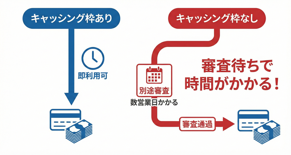 もしキャッシング枠を作っていない場合は別途申し込みが必要となり、この場合は審査に数営業日ほど時間がかかります
