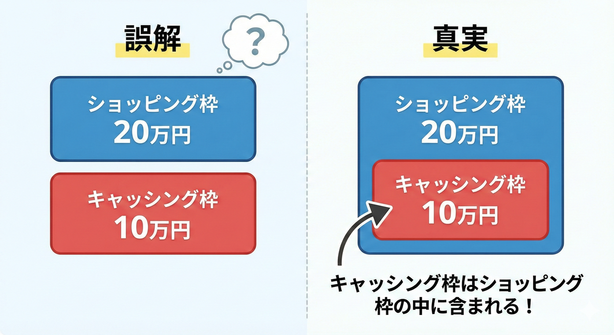 はじめてキャッシングする人で誤解が多いのは、利用限度額のうちショッピング枠とキャッシング枠は別だと思い込んでいることです。