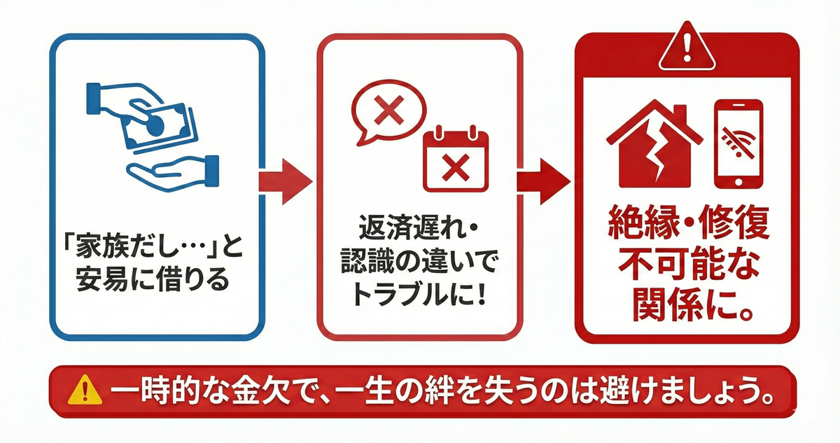 一時的な金欠で大切な家族や友人を失うのはもったいないので、家族や友人から借りるのを考えるのはやめましょう。