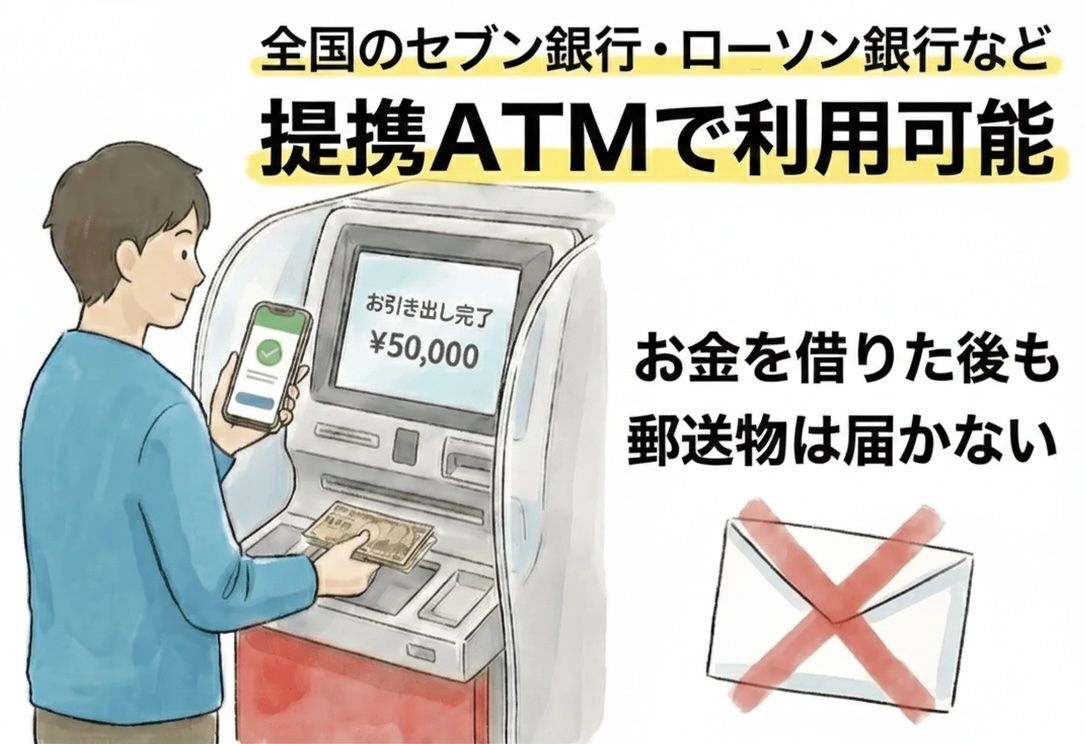 スマホアプリで全国のセブン銀行、ローソン銀行など提携ATMで借りられます。