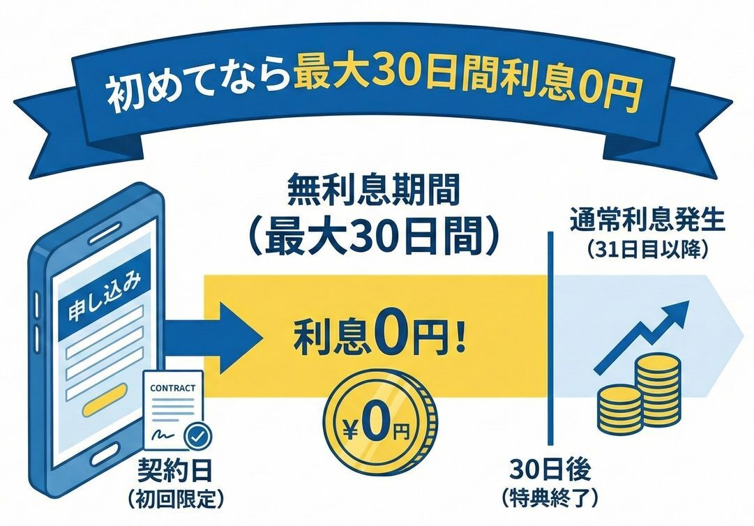 申し込むカードローンによっては最大30日間、利息0円で借りられます。条件は「利用が初めて」のみ。ほぼ無条件と言っていいレベルです。