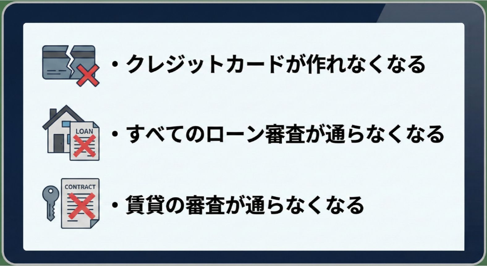 信用情報は今後クレジットカードやローンを契約する時にも使われるため、審査が非常に通りにくくなります。