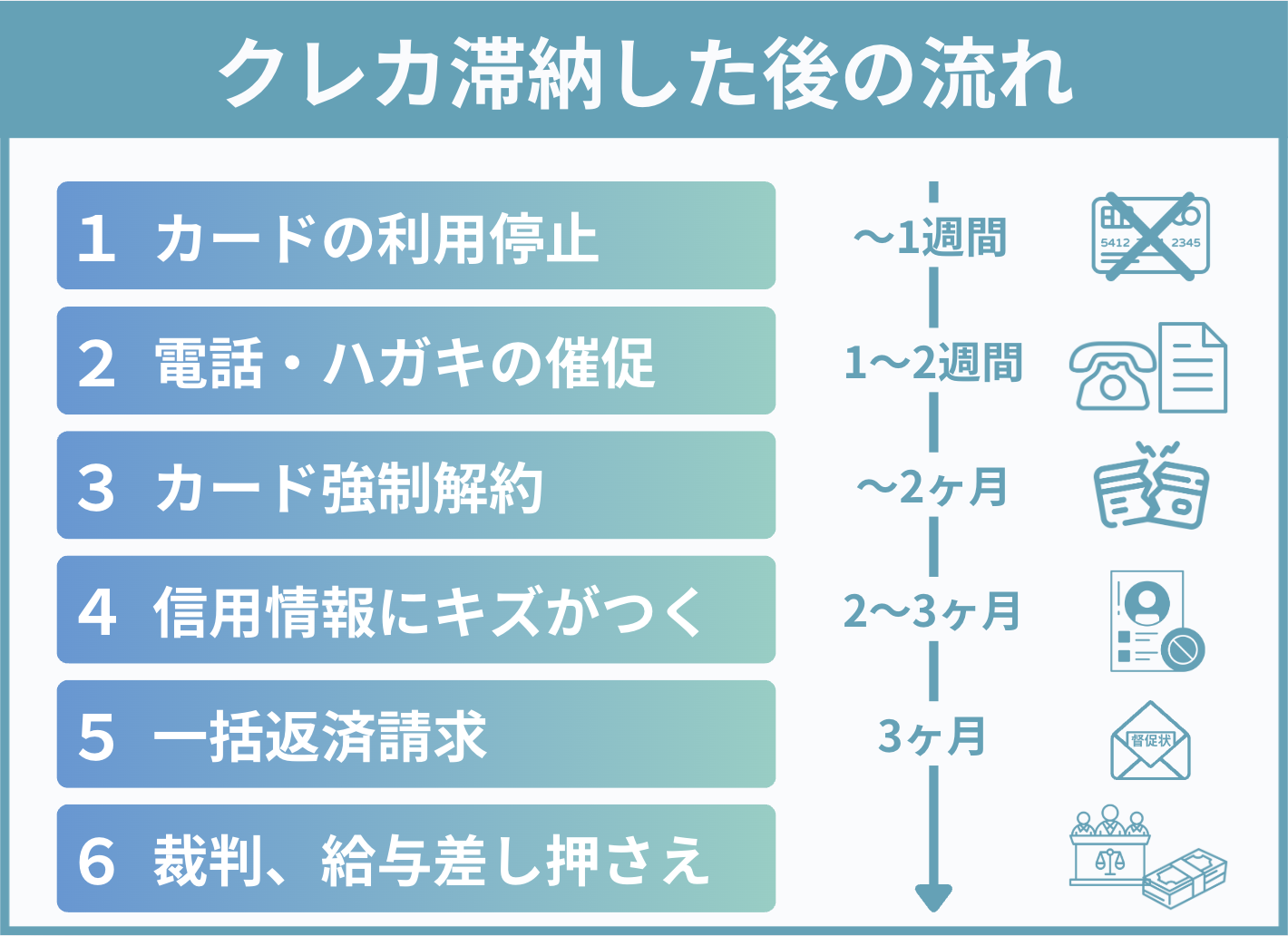 ✓クレジットカード滞納で起きるリスクと流れ